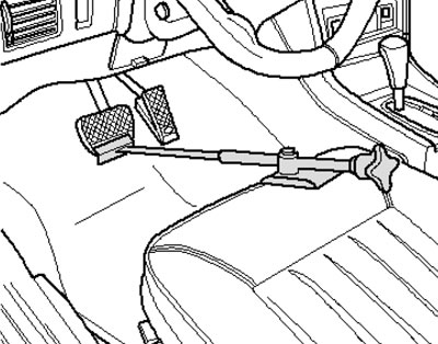 3. Wciśnij pedał hamulca na co najmniej 60 mm i zabezpiecz go odpowiednim urządzeniem (zobacz ilustrację). Podłącz przewody do odpowietrzników obu lewych mechanizmów hamulcowych, odkręć odpowietrzniki i pozwól, aby płyn hamulcowy spłynął do wcześniej przygotowanego pojemnika. Spowoduje to uwolnienie ciśnienia w układzie hydraulicznym hamulców. Dokręć śruby odpowietrzające.