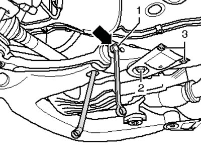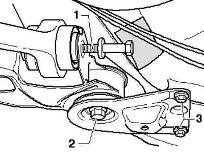 4. Odkręć śruby (2 i 3 na ilustracji) po obu stronach. Jeżeli występuje, odkręć mocowanie poprzeczki tunelu środkowego i lekko je pociągnij do tyłu. Nieznacznie opuść ramę pomocniczą za pomocą podnośnika, odkręć śrubę (1) i wyjmij drążek prowadzący.