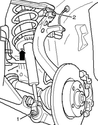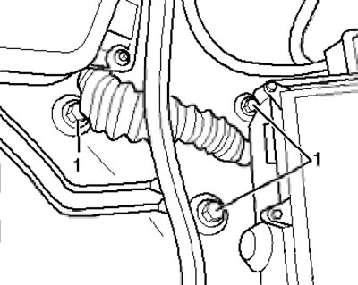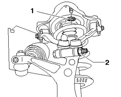 10. Odkręć górne śruby (1 na ilustracji) zamontuj kolumnę zawieszenia w rynnie i wyjmij kolumnę wraz ze wspornikiem. Uważaj, aby nie uszkodzić osłony wału napędowego.