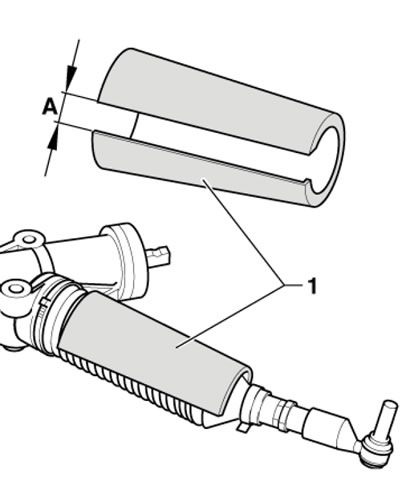 7. Przykryj osłonę drążka kierowniczego osłoną ochronną (zobacz ilustrację) długość (A) - 20-25 mm, tak aby cięcie znajdowało się u dołu. Aby zapobiec uszkodzeniu dolnych łączników, należy podeprzeć zawieszenie tak, aby nie opadło zbyt nisko.