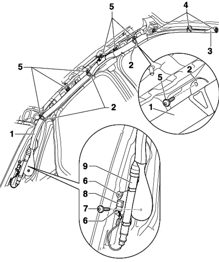 6. Zdejmij trzy uchwyty z ramki pokrywy (2 w ilustracji 17.1) i opuść przednią część nadmuchiwanej kurtyny na przednie siedzenie. Odkręć dwie śruby (6) i zdejmij nadmuchiwaną kurtynę.