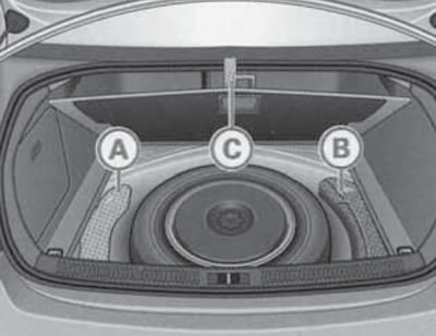 Otwórz bagażnik, podnieś wykładzinę podłogową i zawieś ją na uchwycie haka (Z ilustracji 4) do uszczelnienia bagażnika. Wyjmij zestaw narzędzi pojazdu (A), podnośnik (B) i koło zapasowe (jest przymocowany w środku za pomocą koła zamachowego).