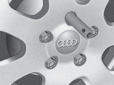W przypadku modeli z pełnowymiarowymi osłonami kół, zdejmij osłonę z uszkodzonego koła, ściągając ją ręką. W przypadku modeli z ozdobnymi osłonami kół należy wyjąć zacisk druciany z zestawu narzędzi pokładowych, włożyć go do otworu w osłonie koła i pociągnąć za zacisk, aby zdjąć osłonę koła (zobacz ilustrację 5). Jeśli śruby kół mają kapturki ochronne, należy je zdjąć za pomocą odpowiedniego ściągacza znajdującego się w zestawie narzędzi pokładowych. Aby to zrobić, nasuń ściągacz na nasadkę, aż się zablokuje, a następnie pociągnij ściągacz do siebie (zobacz ilustrację 6).