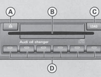Aby załadować płytę, naciśnij przycisk "LOAD" (C) i włóż płytę do gniazda (B) etykietą do góry, nie naciskając płyty - zostanie ona automatycznie umieszczona w następnym wolnym gnieździe. Wolne komórki można zidentyfikować dzięki migającym wskaźnikom na odpowiednich klawiszach numerycznych (D). Po załadowaniu płyty odpowiedni klawisz przestanie migać. Aby załadować dysk do konkretnej komórki, po naciśnięciu klawisza "LOAD" należy nacisnąć odpowiadający mu klawisz z migającym (pusta komórka) lub palenie (zajęta cela) wskaźnik. Jeżeli wybrany zostanie zajęty slot, płyta w nim umieszczona zostanie wysunięta do slotu odbiorczego.