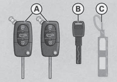 1.1. Zestaw kluczy A - Kluczyk główny z pilotem i wbudowanym kluczykiem mechanicznym; B - Klucz zapasowy; C - Tabliczka z numerami kluczy.
