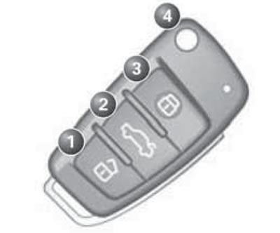 1.2. Główne przyciski klawiszowe 1. Odblokowanie pojedynczego zamka, opuszczenie szyb; 2. Odblokowanie tylko bagażnika (z długim naciśnięciem); 3. Zamykanie zamka pojedynczego, podnoszenie szyb; 4. Rozkładanie/składanie kluczyka mechanicznego