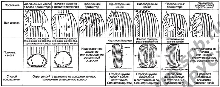 4. Opony stosowane w omawianych pojazdach są wyposażone we wbudowane paski wskaźnika zużycia bieżnika, które stają się widoczne, gdy głębokość bieżnika zmniejszy się do 1,6 mm. Położenie takich wskaźników wskazują napisy TWI na ścianie bocznej opony. Gdy pojawi się wskaźnik, opony uznaje się za zużyte. W większości przypadków zaleca się wymianę opon, których głębokość bieżnika jest mniejsza niż 3 mm (dla opon zimowych - poniżej 4 mm). Głębokość bieżnika można również określić przy użyciu prostego i niedrogiego urządzenia zwanego głębokościomierzem bieżnika.