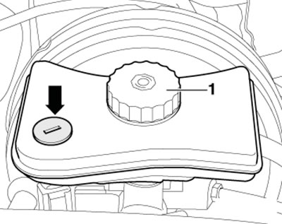 4. Zaznacz pisakiem na ściance zbiorniczka aktualny poziom płynu hamulcowego, aby zapobiec jego przekroczeniu podczas wymiany klocków hamulcowych. Odkręć korek (strzałka na ilustracji) zbiornik płynu hamulcowego i wypompuj około 100 ml płynu hamulcowego ze zbiornika, pozostawiając około 1 cm płynu.
