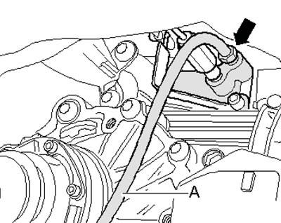 6. W modelach z manualną skrzynią biegów zdejmij korek z odpowietrznika hydraulicznego sprzęgła na siłowniku wysprzęglającym (zobacz ilustrację), podłącz wąż do przyłącza i spuść około 100 ml płynu hamulcowego z hydraulicznego napędu sprzęgła. Dokręć śrubę, zamknij ją korkiem i naciśnij pedał sprzęgła kilka razy.