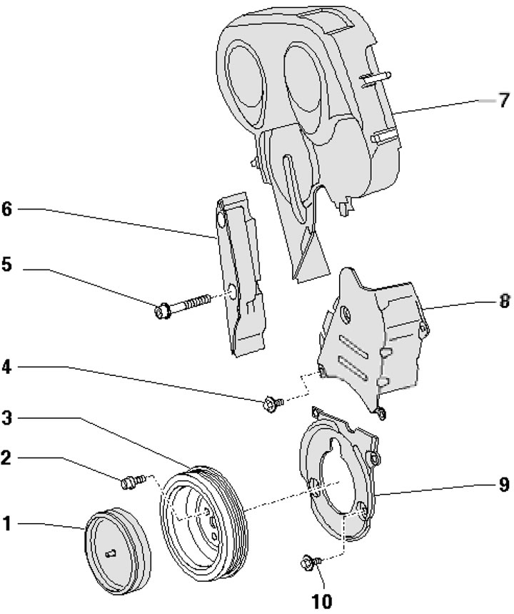 46.1a. Osłony paska rozrządu 1. Korek koła pasowego 3; 2. Śruba mocująca koło pasowe 3, 10 Nm, następnie dokręcić pod kątem 90°, w zależności od wymiany; 3. Koło pasowe wału korbowego; 4. Śruba mocująca pokrywę 8, 10 Nm, zamontowana na gwincie lakierniczym; 5. Śruba mocująca ekran 6, 40 Nm; 6. Ekran dźwiękoszczelny; 7. Górna osłona paska rozrządu; 8/9. Osłona paska rozrządu środkowa/dolna; 10. Śruba mocująca pokrywę 9