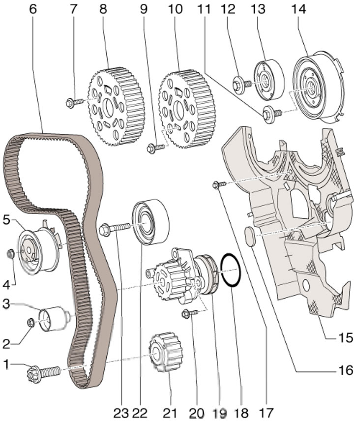 46.1b. Szczegóły montażu paska rozrządu 1. Śruba mocująca koło 21, 120 Nm, następnie dokręcić pod kątem 90°, w zależności od wymiany; 2. Nakrętka mocująca rolkę 3, 20 Nm; 3. Wałek pośredni; 4. Nakrętka mocująca rolkę 5, 20 Nm, następnie dokręcić pod kątem 45°; 5. Rolka napinająca; 6. Pasek rozrządu; 7/9. Śruba mocująca koło 8/10, 25 Nm; 8/10. Koło rozrządu wałka rozrządu wydechowego/dolotowego; 11/12. Śruba mocująca piastę 13/14, 100 Nm; 13/14. Piasta wałka rozrządu wydechowego/dolotowego; 15. Tylna osłona paska 6; 16. Wtyczka; 17. Śruba mocująca pokrywę 15, 10 Nm; 18. Pierścień uszczelniający. Możliwość wymiany; 19. Pompa wodna; 20. Śruba mocująca pompę 19, 15 Nm; 21. Koło zębate wału korbowego; 22. Wałek pośredni; 23. Śruba mocująca rolkę 22, 40 Nm, następnie dokręcić pod kątem 90°, w zależności od wymiany