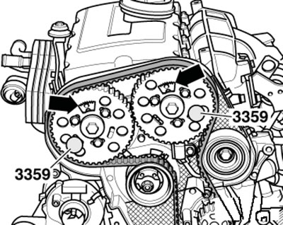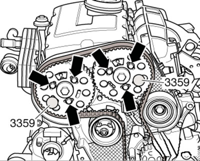 19. Jeżeli wskazana piasta wału dolotowego nie jest zablokowana, poluzuj śruby mocujące koło zębate wału dolotowego i obróć piastę wału dolotowego za śrubę środkową tak, aby można było zamontować ogranicznik nr 3359. Następnie dokręć śruby i wyjmij blokady wału korbowego i wałka rozrządu.