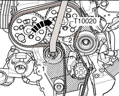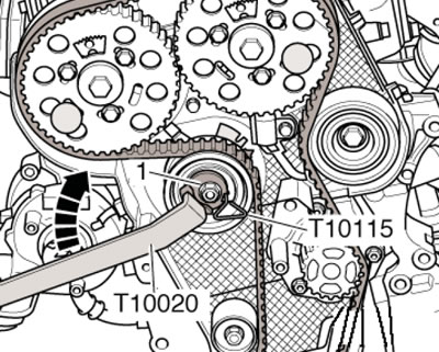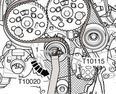 12. Przekręć klucz nr T10020 zgodnie z ruchem wskazówek zegara do oporu i dokręć nakrętkę ręcznie (1 na ilustracji). Zdejmij pasek rozrządu z pompy wody, a następnie z pozostałych kół zębatych.