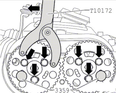 17. Utrzymuj napięcie paska rozrządu za pomocą klucza nr T10172 (zobacz ilustrację), dokręć śruby mocujące oba koła zębate wałka rozrządu. Zdejmij ograniczniki wałka rozrządu i uchwyt wału korbowego.