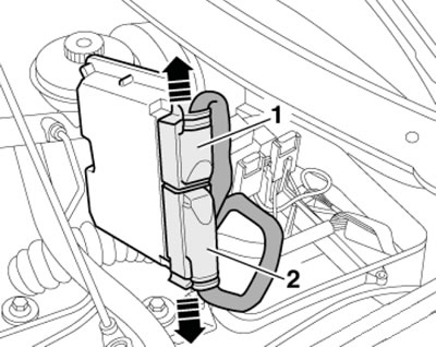 5. Naciśnij zaciski (strzałki na ilustracji) i odłącz złącza ECM (1 i 2). Wyjmij ECM.
