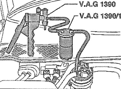 9.2. Podłącz ręczną pompkę niskiego ciśnienia ze zbiornikiem na skropliny, np. VAG 1390, do otworu odpowietrzającego i włóż do niego wąż ssący pompki