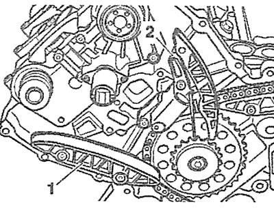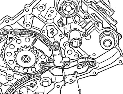 3. Odkręć odpowiednie śruby mocujące i zdejmij pręt 1 prowadnicy łańcucha napędowego wałka rozrządu zaworów dolotowych oraz napinacz 2 na lewej głowicy cylindra (zobacz ilustrację).