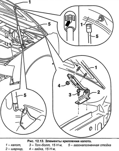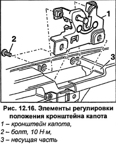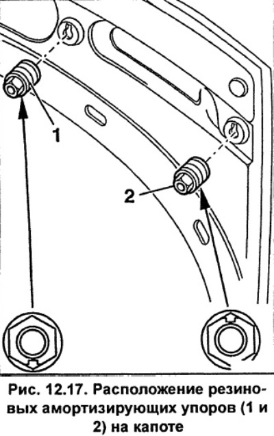 Wyreguluj wysokość maski względem błotników. W tym celu należy wkręcić regulacyjne ograniczniki amortyzujące 1 i 2 (rysunek 12.17), znajduje się przed maską. Odkręcając gumowe amortyzatory, wyreguluj wysokość przodu maski względem błotników. Po zamknięciu maski amortyzatory powinny swobodnie opierać się o część podpierającą.