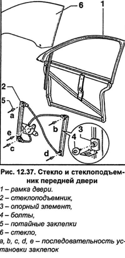 Podczas montażu nowej szyby wsuń szybę drzwiową w prowadnice i opuść ją całkowicie w kierunku słupka B. Podnieś szybę za pomocą podnośnika szyb bez śrub 4 (rysunek 12.37) do końca, a następnie zamknij elementy podporowe.