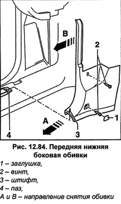 Odkręć dwie śruby 2 (rysunek 12,84). Pociągnij boczną listwę w kierunku strzałki A (rysunek 12,84), aż kołek 3 wysunie się z rowka 4.