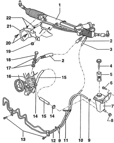 Rysunek 9.10. Elementy układu wspomagania kierownicy pojazdu z silnikiem 4-cylindrowym