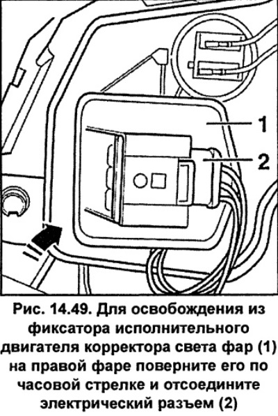 Prawy reflektor.Obróć silnik siłownika korektora 1 (rysunek 14.49) zgodnie z ruchem wskazówek zegara i zwolnij blokadę.