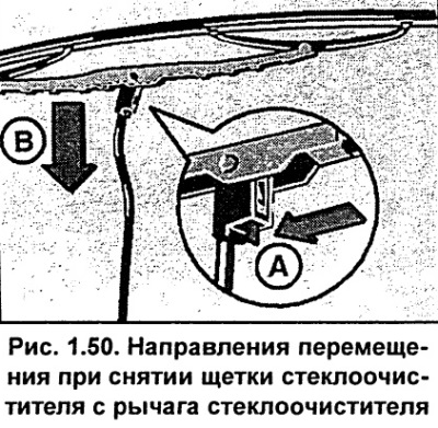 Naciśnij przycisk zwalniający wycieraczkę (strzałka A, rysunek 1,50), następnie przesuń szczotkę wzdłuż dźwigni (strzałka B) i przesuwając ją w przeciwnym kierunku, zdejmij ją z ramienia wycieraczki.