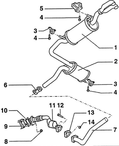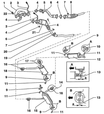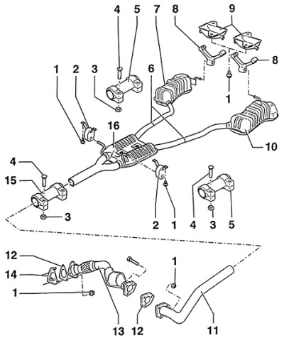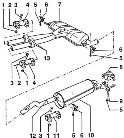 Rysunek 4D.4. Układ wydechowy w samochodach AUDI A6 z napędem na przednie koła i silnikiem wysokoprężnym 1.9-I-TDI o mocy 110 KM i pojazdów z napędem na wszystkie koła