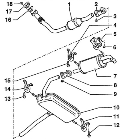 Rysunek 4D.3. Układ wydechowy w samochodach AUDI A6 z napędem na przednie koła i silnikiem benzynowym 1.8-I