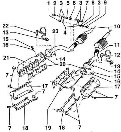 Rysunek 4D.6. Kolektory wydechowe i rury wydechowe w samochodach AUDI A6 z silnikiem benzynowym V6