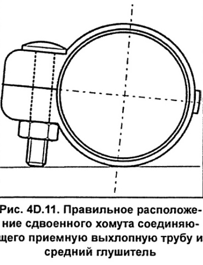 Podłącz rurę dolotową spalin do środkowego tłumika za pomocą podwójnej obejmy, ustawiając ją tak, aby dolna krawędź śruby mocującej obejmę znajdowała się na poziomie rury gaśnicy (patrz 4D.11). Śruby powinny znajdować się po lewej stronie rury. Na tym etapie nie dokręcaj jeszcze śrub całkowicie.