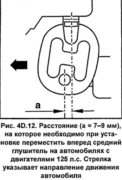 Wytworzyć naprężenie wstępne poprzez przesunięcie środkowego tłumika do przodu o 7-9 mm (patrz 4D.12) i zabezpiecz go w tej pozycji. Jest to konieczne, aby w przypadku wystąpienia rozszerzalności cieplnej spowodowanej nagrzewaniem, układ wydechowy znalazł się w prawidłowej pozycji.